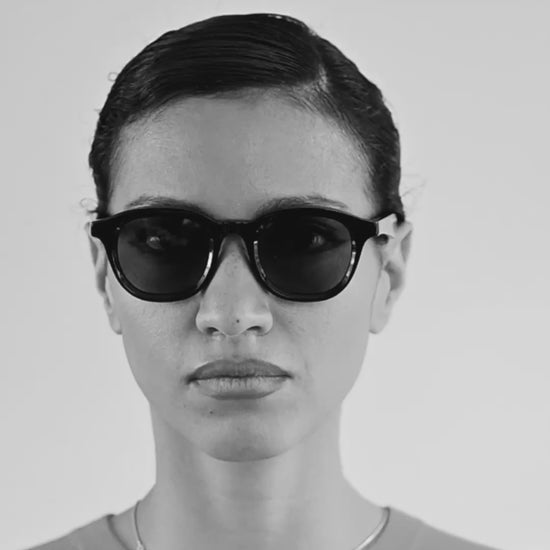 Lentes solares de diseño tipo panto con puente de ojo de cerradura, elaborados en acetato Mazzuchelli con alma de titanio japonés. Tamaño mediano con un estilo clásico y atemporal.