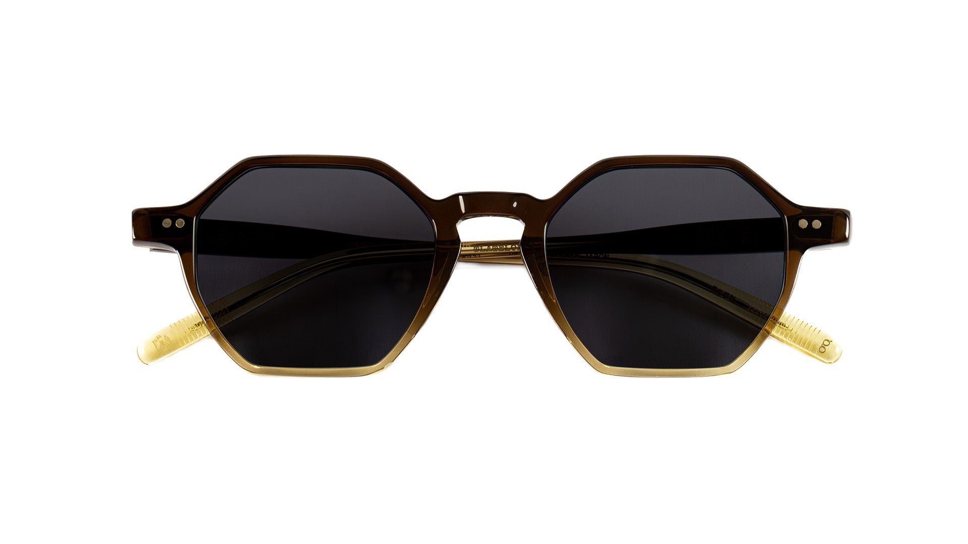 Lentes de sol, de forma hexagonal. Con protección UV 100. De acetato ligero y sumamente resistente. Diseñados en México, hechos a mano en Japón por artesanos dedicados a la creación de armazones de excelente calidad. Con remaches de doble punto y bisagra de doble barril.