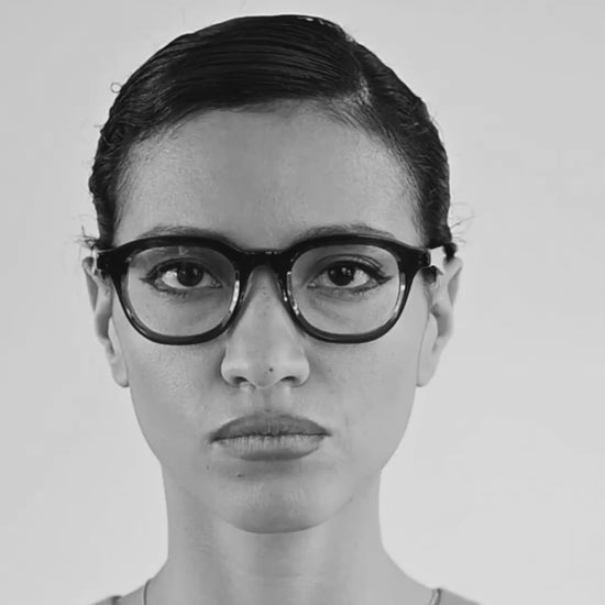 Lentes oftálmicos de diseño tipo panto con puente de ojo de cerradura, elaborados en acetato Mazzuchelli con alma de titanio japonés. Tamaño mediano con un estilo clásico y atemporal.